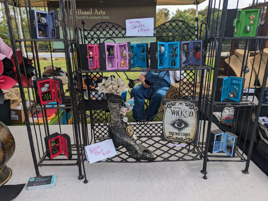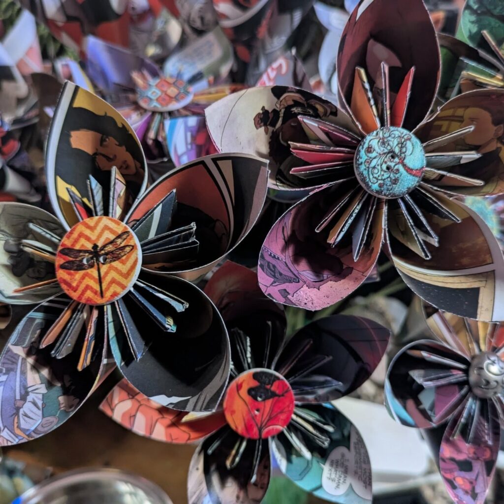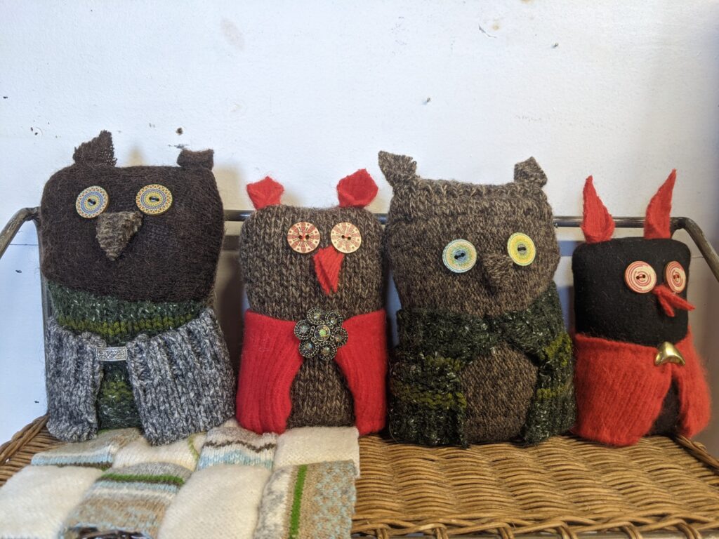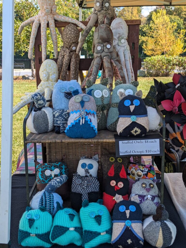 Hybrasil Arts makes origami flowers from vintage papers, soft sculpture owls and octopi, mini potions cabinets, steampunk jewelry, handblown glass and many other upcycled treasures.