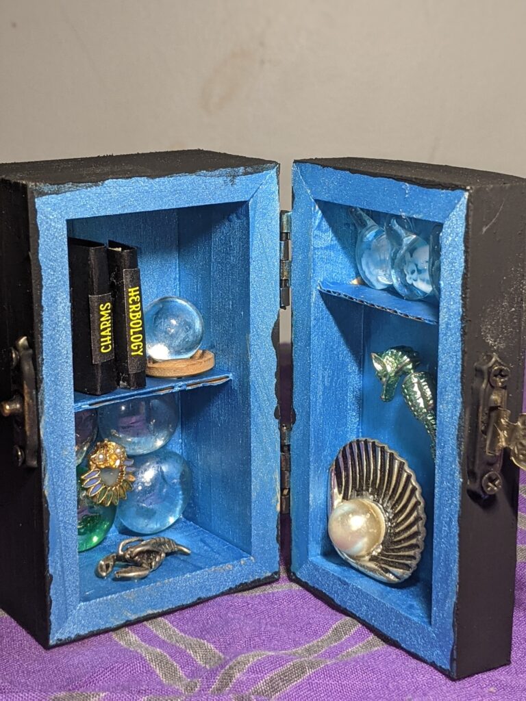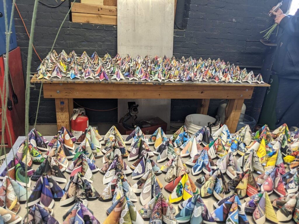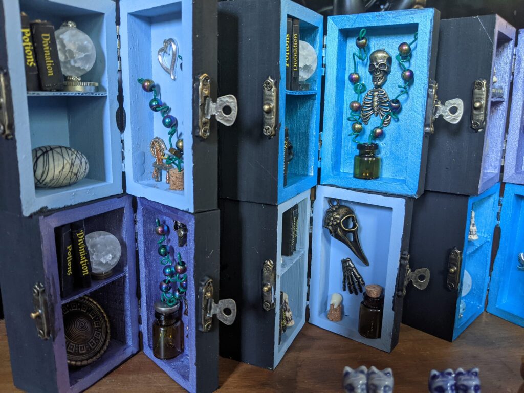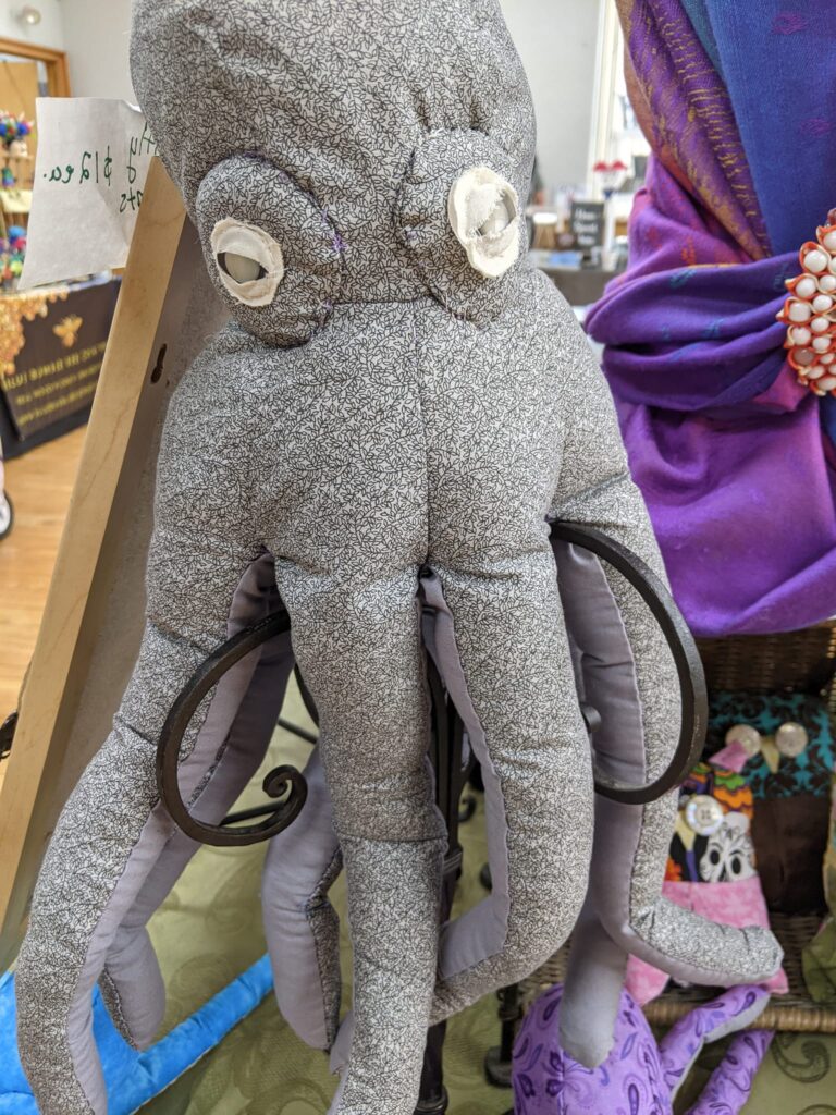 Hybrasil Arts makes origami flowers from vintage papers, soft sculpture owls and octopi, mini potions cabinets, steampunk jewelry, handblown glass and many other upcycled treasures.
